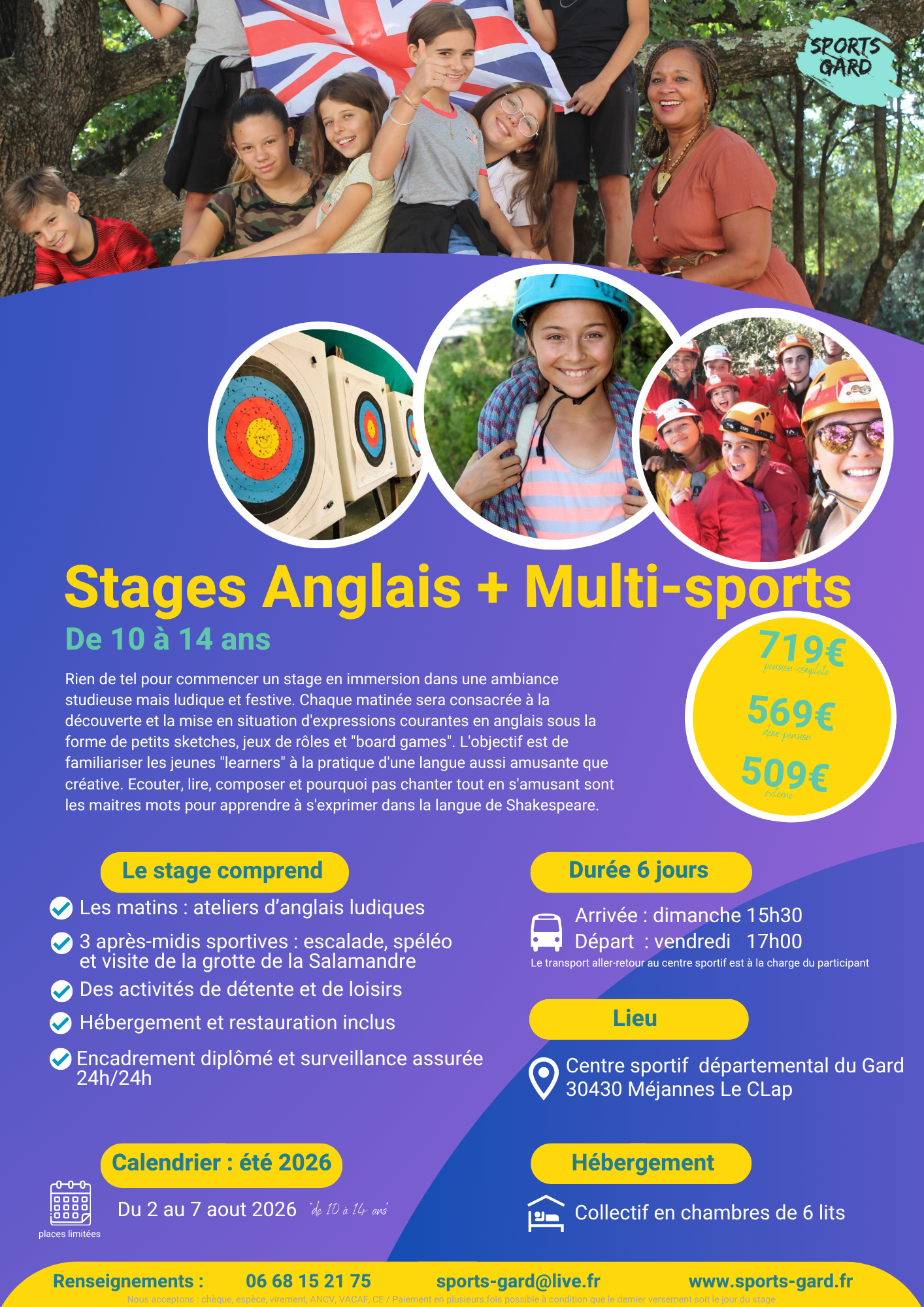 Sports Gard a pour objectif de permettre à un maximum d’enfants, issus de milieux divers, de partir en vacances en proposant plusieurs types de stages sportifs et de conduite accompagnée. Ces derniers se déroulent au sein du centre départemental « Espace Gard Découvertes » situé à Méjannes Le Clap (30) et sur le gite de l’arque à St Maurice de Cazevieille.